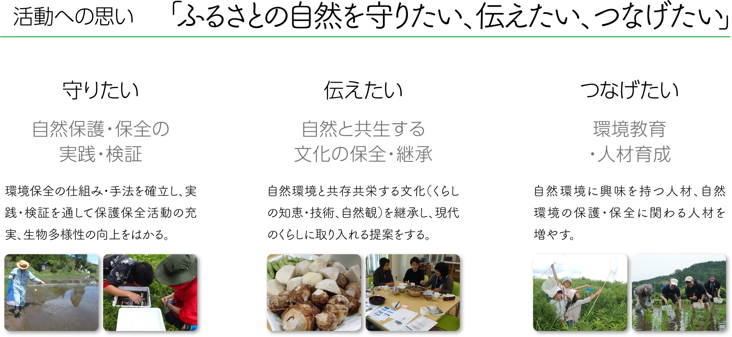 「田んぼはお米と共にたくさんの生きものを育む場所」という考えの下、生きものの生息環境に配慮した田んぼづくりに取り組んでいます。例えば、お米の無農薬栽培や田んぼとつながったビオトープの整備、生きもの調査等を実践しています。 田んぼで暮らしていた「かつて当たり前にいた生きもの達」を守り、いつしかトキですら生息できるような田んぼづくりを目指します。