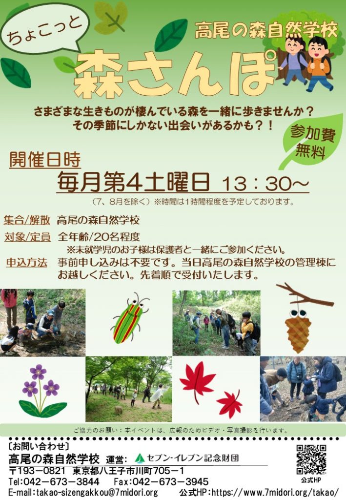 | お問い合わせ | 高尾の森自然学校 tel042-673-3844 fax042-673-3945 E-mail takao-sizengakkou@7midori.org URL https://www.7midori.org/takao/ |